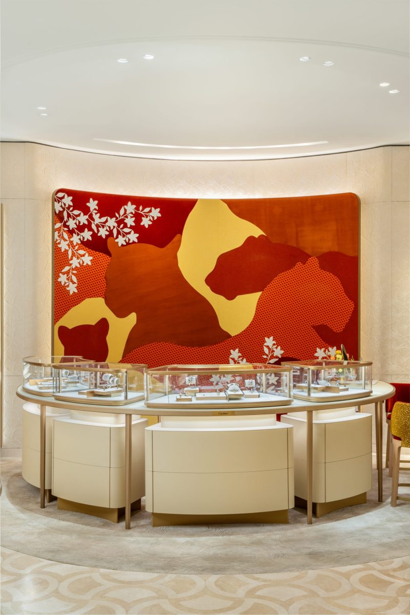 In the boutique, guests are greeted by a shimmering golden façade that invites them to discover the wonders of Cartier. Once inside, they discover the Cartier concept masterfully infused with local Filipino references in a space of 321 sqm.