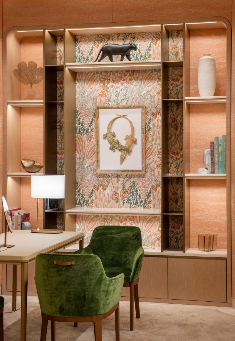 Towards the left of the boutique, guests feel a sense of warm elegance subtly evoked by color codes of mother-of-pearl with straw marquetry. Complemented by earth-toned fabrics within the same space, the vibrancy of Philippine tropical foliage and wildlife are further represented by a bespoke De Gournay focus wall, specially handpainted for the new boutique.