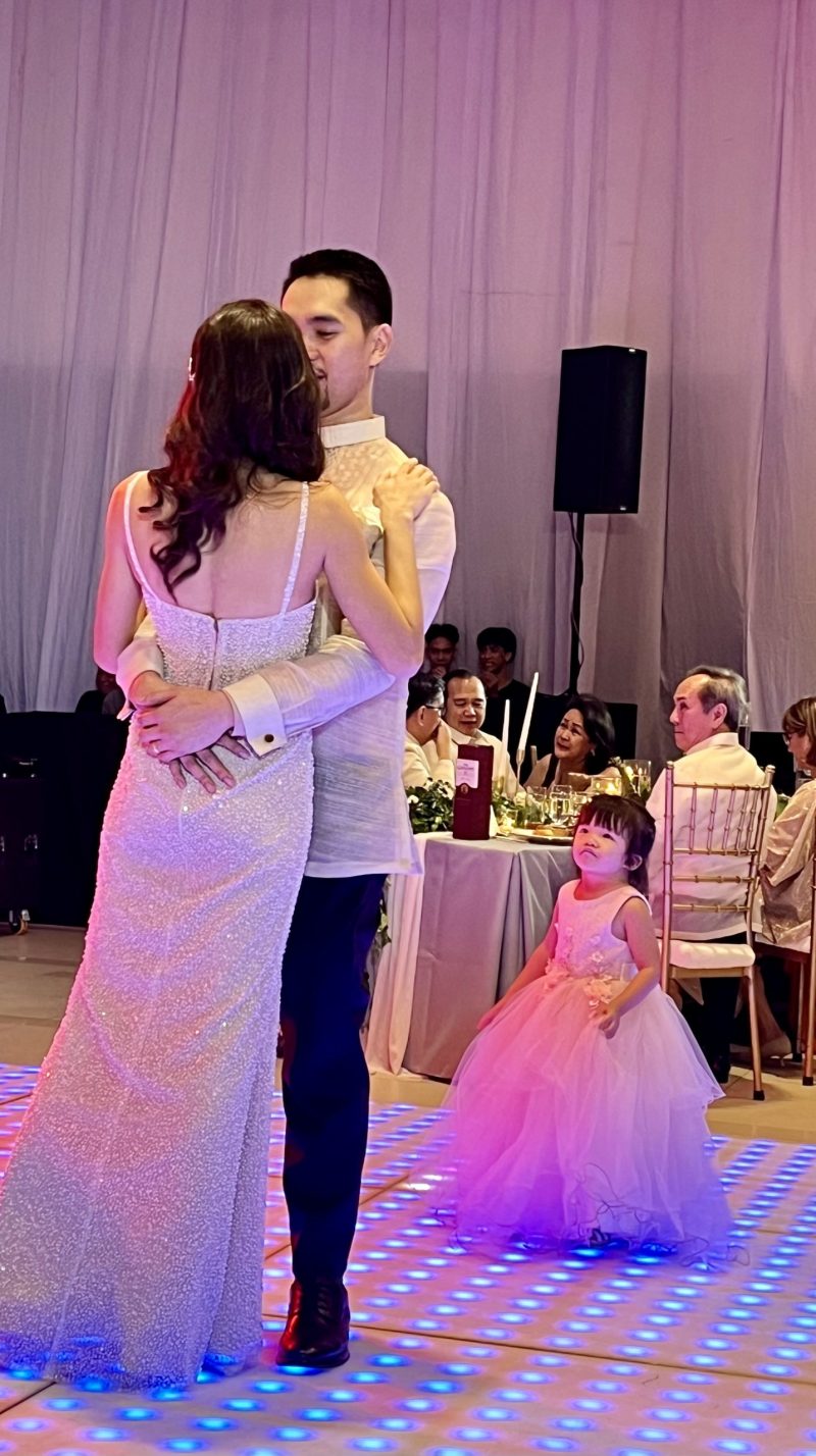 The newlyweds’ moment at the reception, before the watchful eye of Raf’s niece Galilee