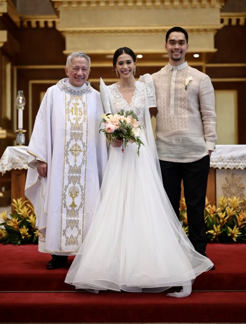 The newlyweds with officiating priest Fr. Tito Caluag whose online Sunday Masses during the lockdowns brought the couple closer