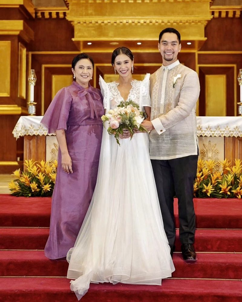 The newlyweds with former Vice President Leni Robredo, one of the principal sponsors (From Raf Sobrepena’s IG)