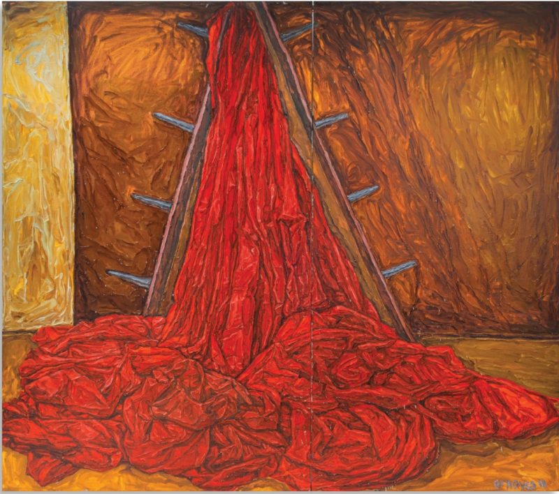 From the Patrick and Yolanda Johnson collection, Elaine Navas (b. 1964), ‘Red Parachute’ (diptych), signed and dated 2014 (lower right), oil on canvas, 96” x 109” (244 cm x 277 cm), sold for P3,364,480
