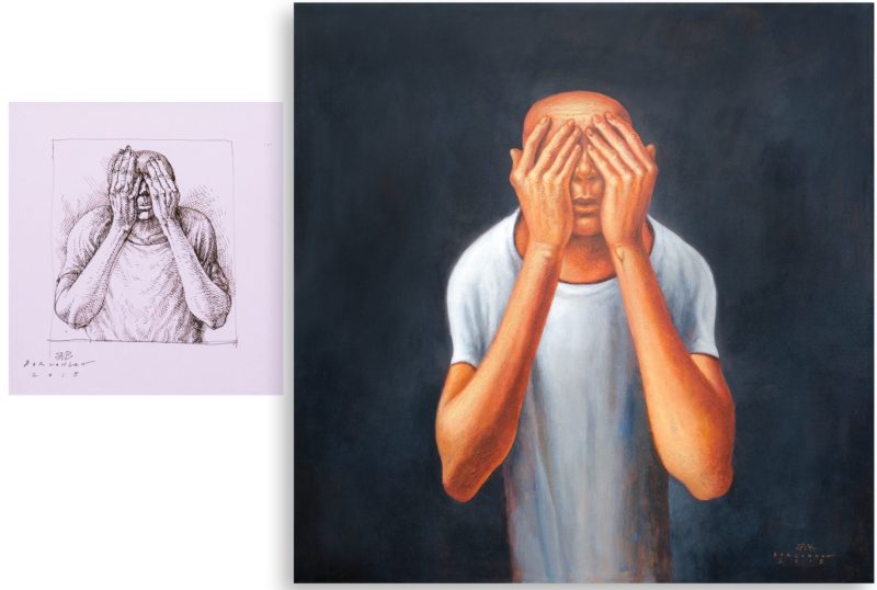 a) Study of ‘Guilty, ‘signed and dated 2015 (lower left), ink on paper, 8” x 7” (20 cm x 18 cm)