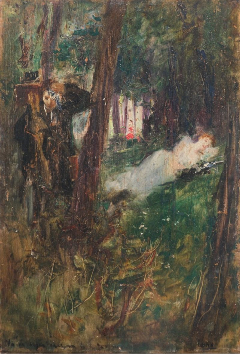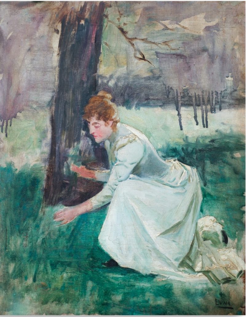 From the Ambassador Pedro Conlu Hernaez collection, Juan Luna (1857–1899), ‘Study of Paz Picking Flowers in a Garden,’ signed lower right, oil on wood, 18” x 14 1/2” (46 cm x 37 cm), sold for P6,008,000