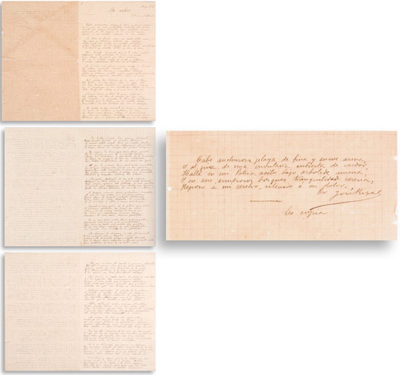 From the collection of Trinidad H. Pardo de Tavera, José Rizal (1861–1896) Mi Retiro, handwritten and signed by Jose Rizal himself, ca. 1895–1896, two leaves of graph paper with four pages with handwriting, enveloped addressed “Para Sr Dr Pardo, Calle Centeno, No. 7” (for Señor Doctor Pardo), leaf 1: 8 1/4” x 10 1/4” (21 cm x 26 cm), leaf 2: 8 1/4” x 10 1/4” (21 cm x 26 cm), envelope: 4 1/2” x 5 3/4” (11 cm x 15 cm), sold for P5.407,200