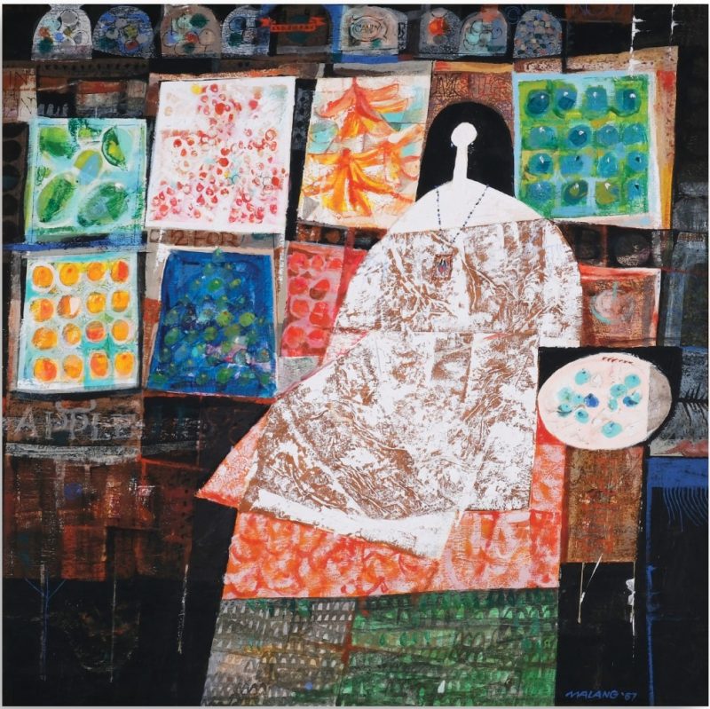 From the Don J. Antonio Araneta collection,  Mauro Malang Santos (1928–2017), ‘Escapulario,’ signed and dated 1967 (lower right), acrylic on canvas, 20” x 20” (51 cm x 51 cm), sold for P3,364,480