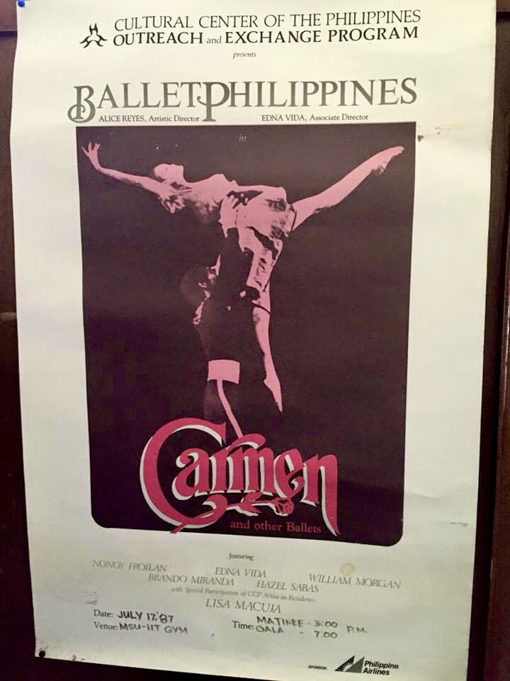 The premiere of Alice Reyes’ Carmen in 1984 at the Cultural Center of the Philippines (CCP) had me in the lead role, with Nonoy Froilan as Don Jose. This was the only title role my sister, Alice Reyes, gave me throughout my dance career. I did lead roles in many of her ballets, but Carmen was a challenge because she was choreographing it on me.