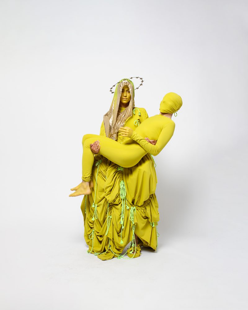 The result was a garment that felt very organic. It was also a piece that was closest to home, directly inspired by the Pieta, a religious statue currently kept in his grandmother’s home. “I kept seeing the image while doing research after my grandfather’s death, so I dug into its history and importance within my own family. It definitely left a mark.”
