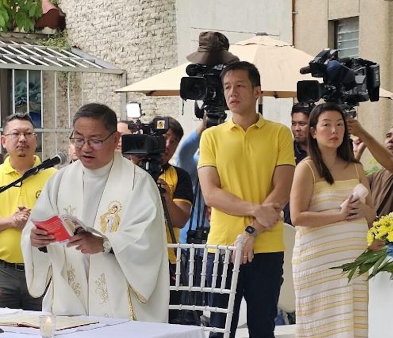Fr. Manoling Francisco, SJ officiates at Mass. Behind him is Ninoy’s grandson, Miguel Aquino Abellada, with wife Stephanie. (Contributed Photo)