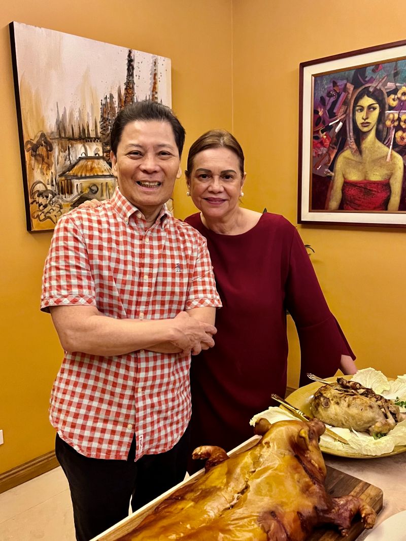 Rene and Ann Puno at their dining table, cochinillo as highlight
