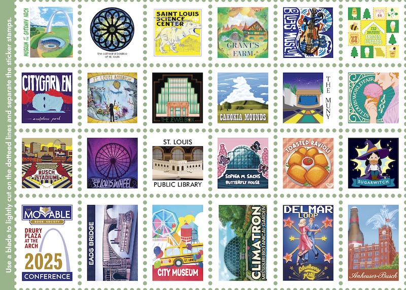 The stamp sticker sheet for the Tiny Travel Guide to St. Louis