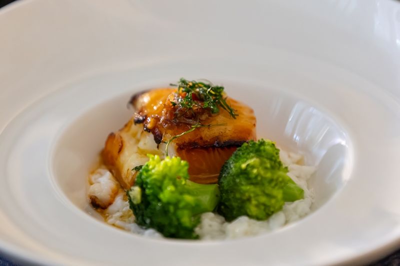 Main course of baked cod fish, XO sauce, broccoli, fluffy egg white and crispy leeks and ginger