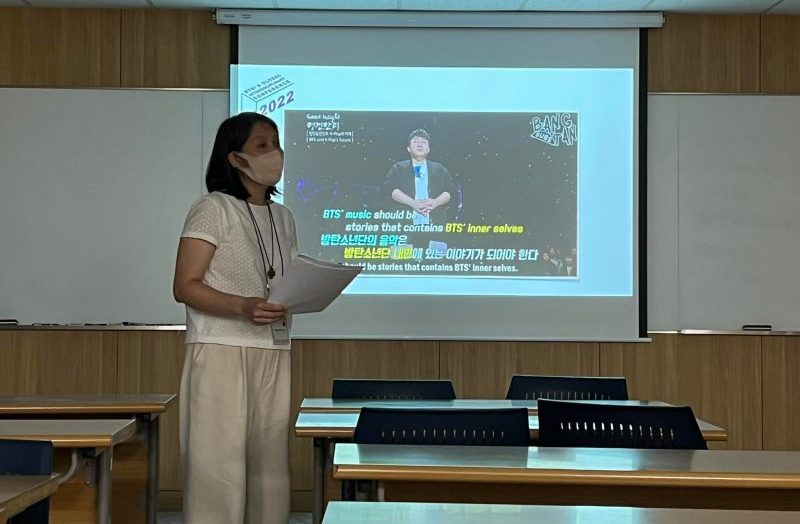 The author presenting a slide of Big Hit Entertainment (now Hybe) founder and head Bang Si-hyuk in the conference