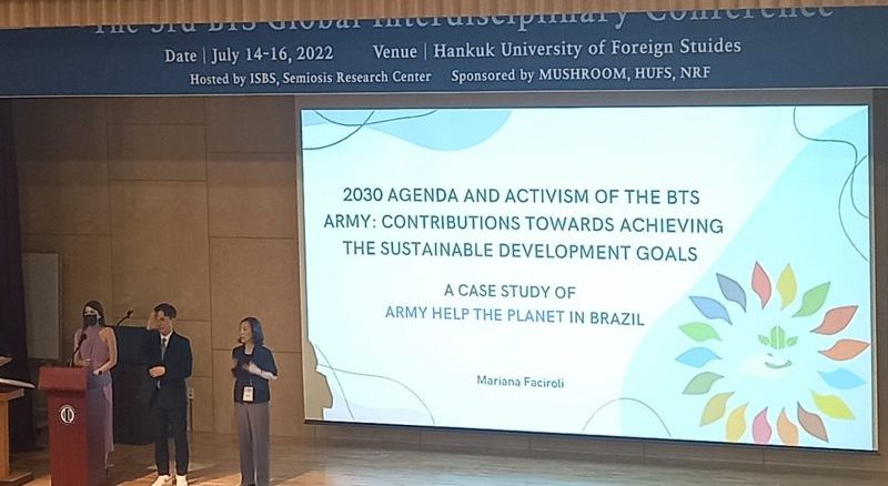 Mariana Faciroli, founder of ARMY Help The Planet, Brazil, speaks at the podium. When fire broke out in the Amazon, #armyhelptheplanet trended on Twitter, ARMYs got together in a group chat, joined by experts, environment engineers, lawyers, and more. Now the group has grown into a large and active force in many social movements in Brazil.
