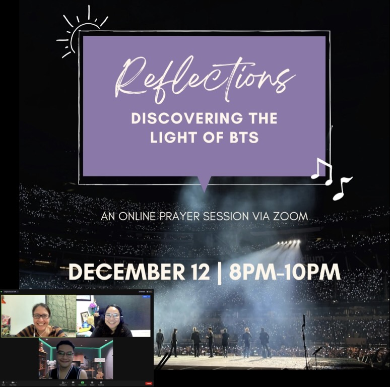 Everything turned out well in the end. At least three of the participants said it was “healing” for them. As I look back, there was intentionally no direct mention of God in our presentation and in the sharing, but the experience of healing is definitely an experience of God. In ARMY forums, one could easily find testimonies about how BTS has been a source of healing for them, and BTS, in fact, has a number of songs where they offer themselves to ARMY as a means for healing (Magic Shop, 2! 3!, Mikrokosmos, Lights, etc.). My own experience of BTS is deeply spiritual; God speaks through BTS, too! And this became my strongest motivation for submitting our paper for the conference. At some point I felt out of place, but in hindsight, I think we found our unique voice.