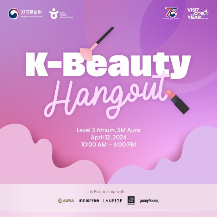 The Korean Cultural Center in the Philippines (KCC) and Korea Tourism Organization Manila Office (KTO-Manila), in collaboration with Jenny House, AMOREPACIFIC Philippines, and SM Aura, is thrilled to announce its first-ever beauty event, “K-Beauty Hangout”, scheduled to take place on April 12, 2024, Level 3, Atrium, SM Aura.