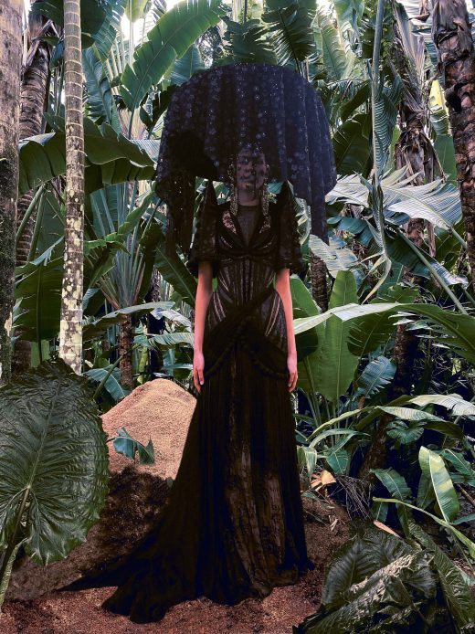Mobo even made a headpiece based on the “sarok,” a traditional wide-brimmed hat from the Philippines, usually made of either rattan or Phragmites reeds, and draped with tulle to create a mourning veil.