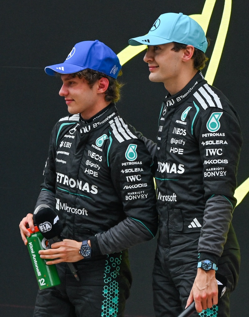 George Russell (right) of Mercedes-AMG Petronas Formula One Team comforts an emotional Kimi Antonelli after Antonelli won the 2026 Chinese Grand Prix, his first career Formula 1 victory, at the Shanghai International Circuit, in Shanghai, China, on March 15, 2026. Antonelli and Russel wear the Pilot’s Watch Chronograph 41 TOP GUN Oceana (Ref. IW389404) and Pilot’s Watch Automatic 41 George Russell (Ref. IW328107), respectively. (Photo by Artur Widak/NurPhoto)