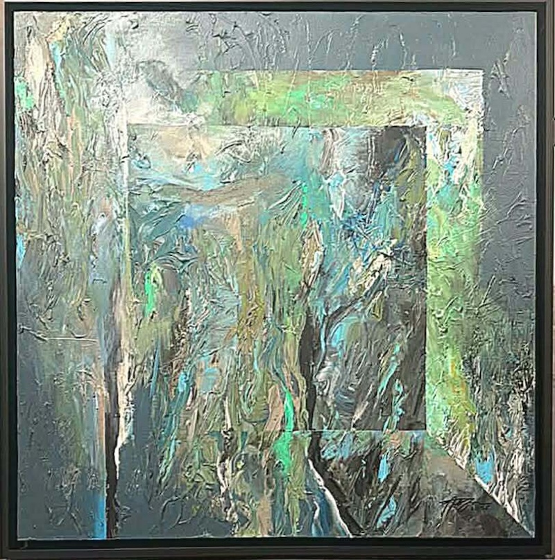 In other works dominated by greens and grays, the feeling turns more organic. These pieces resemble old stone walls slowly overtaken by moss and lichen. Gonzales doesn’t simply apply paint; he builds it into a crust, layering until the surface becomes almost sculptural.