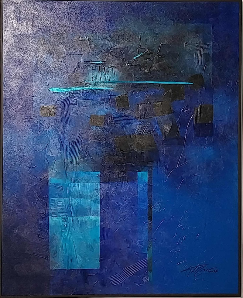 He says his work thrives on that push and pull between structure and mess. You can trace straight lines that suggest an underlying grid, only to see them smeared over with thick, heavy paint. In one large blue piece, color shifts from deep midnight tones to electric teals, evoking deep water or a night sky. The mood is introspective, yet the scratched and scraped surface gives it a gritty, physical presence, as if the painting has lived a hard life.