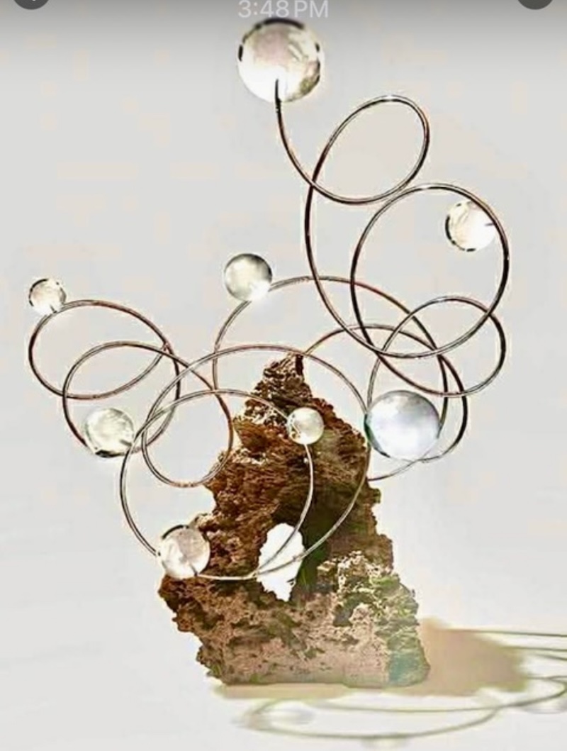 The Astra Gratia collection is named after a simple idea: graceful stars, turning and glowing in an endless dance. In one piece, she balances the rugged, volcanic texture of a monolith with a delicate, spiraling vortex of stainless steel. The spiral ends in her signature glass spheres, which looks like drops of celestial dew.