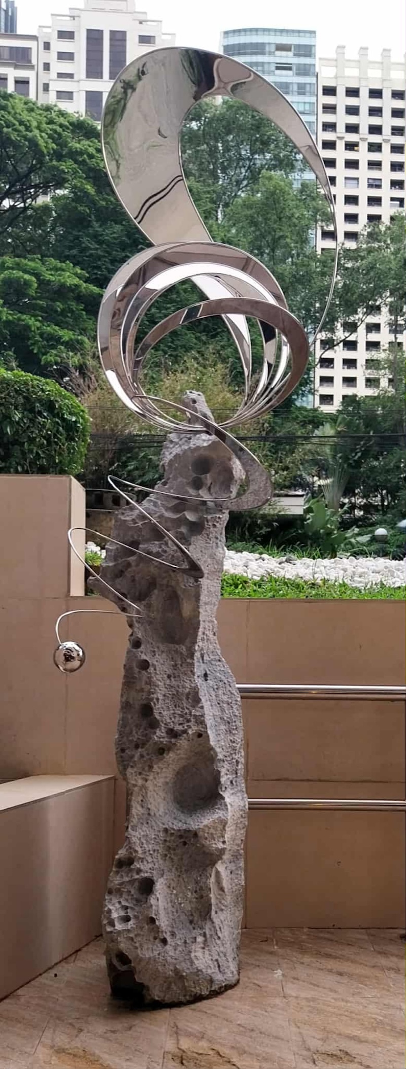 The sculpture has a faintly archaeological feel, as if it were a future relic found on an ancient site. The stone looks primordial, the metal precise and engineered. Still, the overall effect isn’t cold. That small tethered orb adds a playful note, keeping the work from feeling too monumental or serious.
