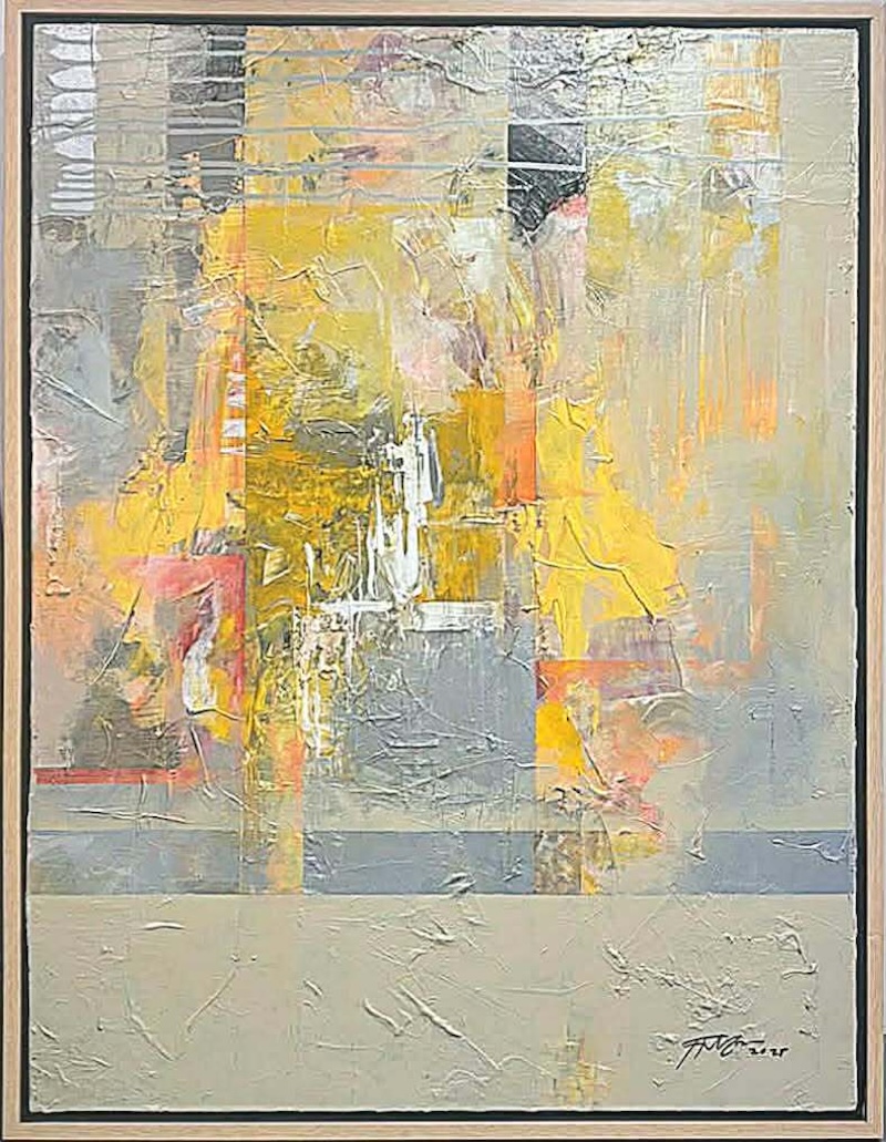 At first glance, the surfaces can feel chaotic and heavily worked, thick with paint and time. But Gonzales knows when to stop. He brings the energy under control by adding disciplined lines or solid blocks of color, often squares or rigid forms. These shapes act like windows in the painting, moments of clarity amid the blur. They hold the work together without erasing its emotional charge.