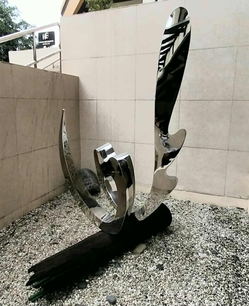 The finish is what brings Wave V to life. The steel is polished to a mirror sheen that reflects its surroundings, including the people standing nearby. As viewers move, their reflections bend and shift across the curved surface, making the sculpture feel like an event unfolding in real time. You see yourself briefly, then lose yourself again in the curve.