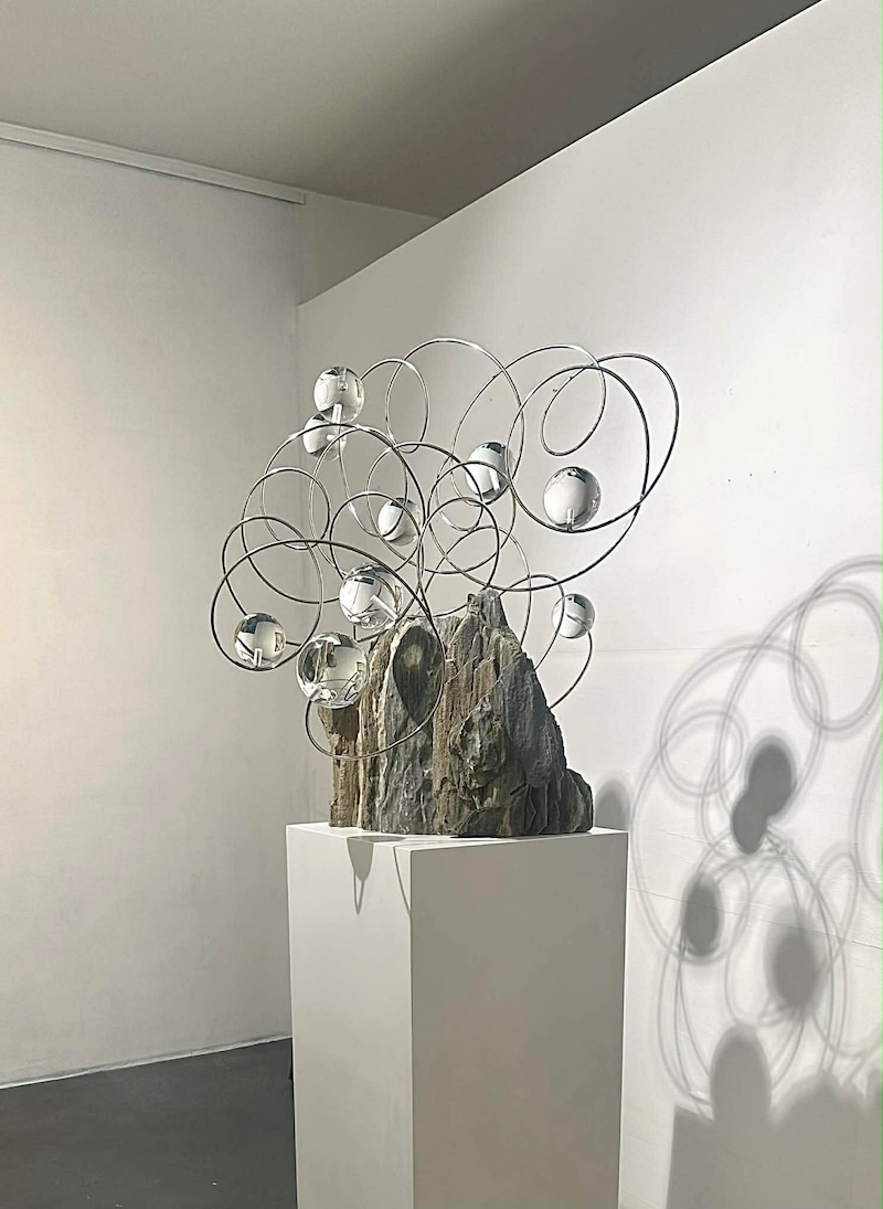 In the second work, the same tension appears in a different form. Graceful, lyrical wires rise from a heavy marble foundation, suggesting a surge of energy moving upward. By combining industrial metal with the character of Romblon marble, Pilapil creates a landscape that feels both intellectual and calm. The reflective surfaces pull viewers into the work, making them part of the experience. These are not just shapes on exhibit. They are openings that invite you to step out of daily life and into a larger, more cosmic conversation.