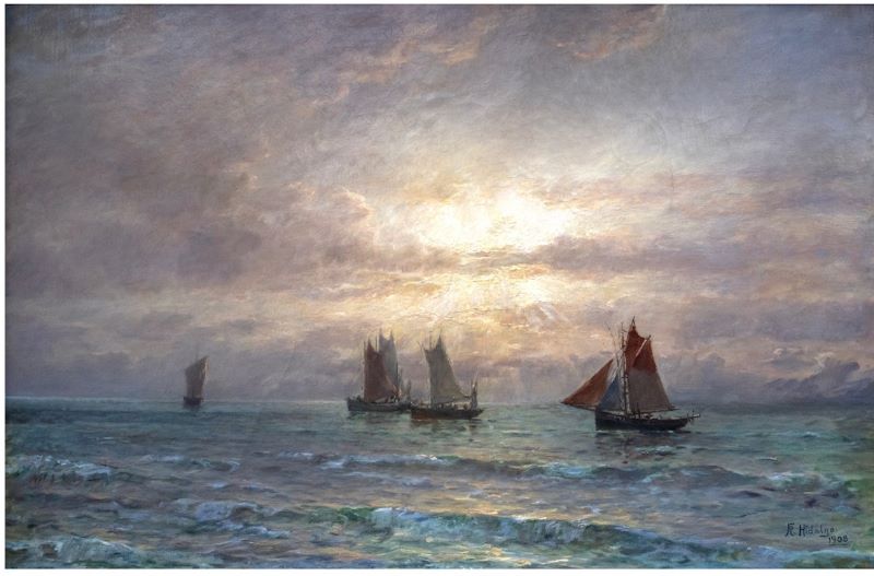 Félix Resurrección Hidalgo (1855-1913), ‘Barcos de la Vela (Sailboats),’ 1908, oil on canvas, 24″ x 37″ (61 cm x 94 cm)