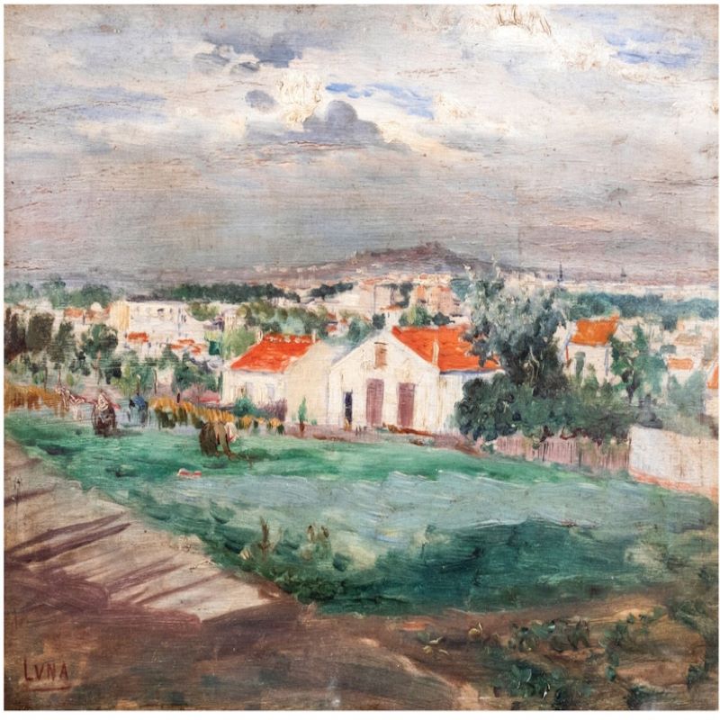 From the Ambassador Pedro Conlu Hernaez collection, Juan Luna y Novicio (1857-1899), ‘Landscape in Bilbao,’ ca. 1893, oil on wood, 12″ x 17″ (30 cm x 43 cm)