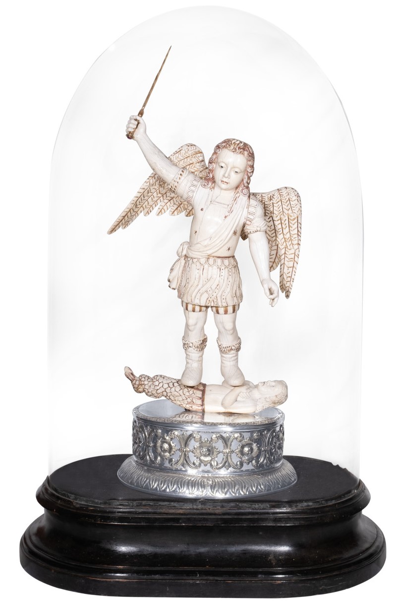 Formerly from the Romeo Jorge collection, ‘San Miguel Arcangel,’ 17th century, Binondo, Manila, ivory, silver, and gold, ivory santo: H: 19″ (48 cm) L: 3 1/2″ (9 cm) W: 13″ (33 cm), sword: 18k gold, 36 grams, virina: H: 35″ (89 cm) L: 15″ (38 cm) W: 23″ (58 cm), silver base: H: 4 3/4″ (12 cm) L: 8″ (20 cm) W: 11 1/2″ (29 cm)
