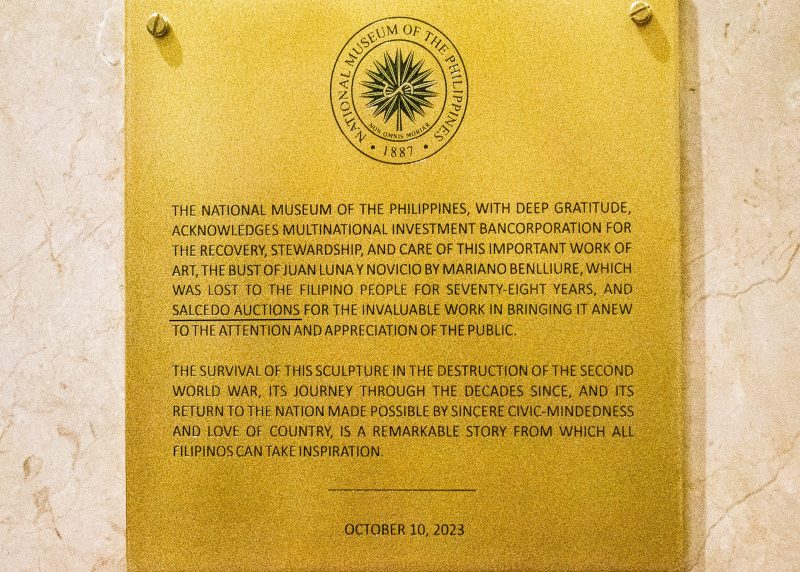 THE NATIONAL MUSEUM OF THE PHILIPPINES, WITH DEEP GRATITUDE, ACKNOWLEDGES MULTINATIONAL INVESTMENT BANCORPORATION FOR THE RECOVERY, STEWARDSHIP, AND CARE OF THIS IMPORTANT WORK OF ART, THE BUST OF JUAN LUNA Y NOVICIO BY MARIANO BENLLIURE, WHICH WAS LOST TO THE FILIPINO PEOPLE FOR SEVENTY-EIGHT YEARS, AND SALCEDO AUCTIONS FOR THE INVALUABLE WORK IN BRINGING IT ANEW TO THE ATTENTION AND APPRECIATION OF THE PUBLIC.