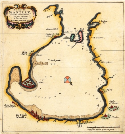 Herman Moll’s ‘Philippine Islands’ (1720) featuring a unique horizontal orientation of the Bicol Peninsula (left); ‘La Baie de Manille’ (Manila Bay)  map by Peter Van Der AA, ca 1729.