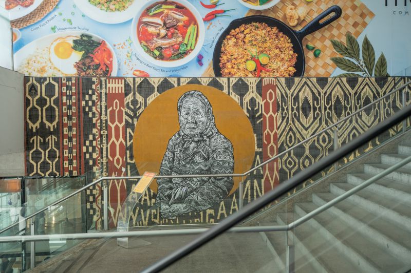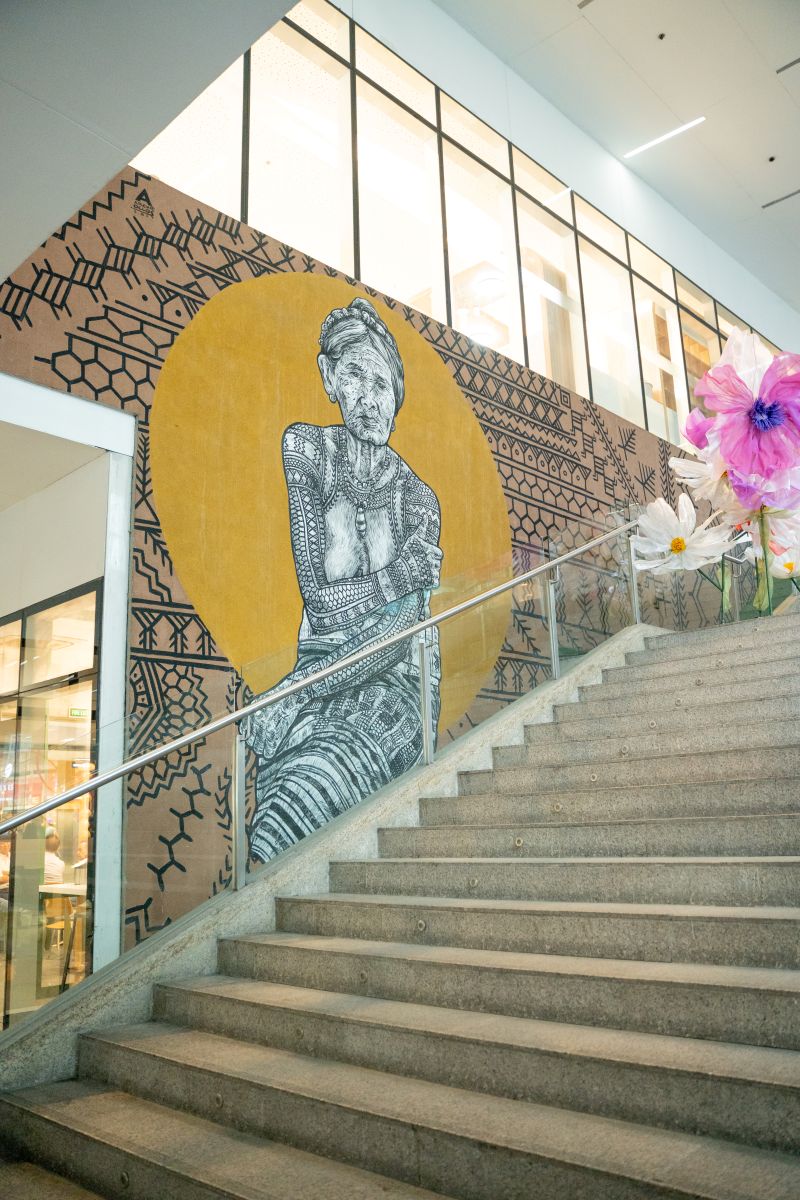 A mural of Apo Whang-Od, the legendary hand tap tattoo artist of Kalinga’s Last Mam-babatok, by Archie Oclos at the Grand Staircase, SM Aura.