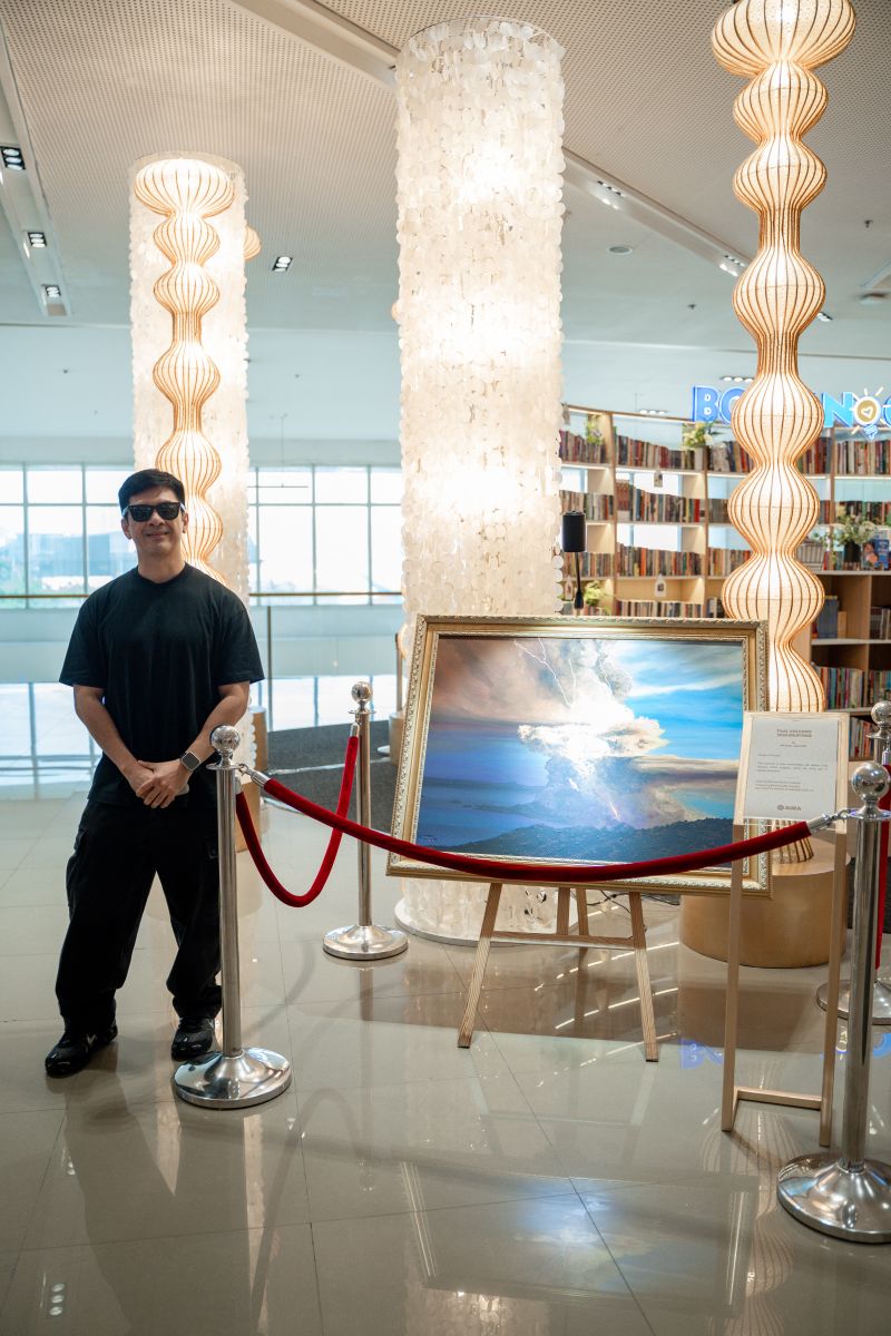 Michael Sagaran with his artwork Taal Volcano 2020 Erupting at the Book Nook, Level 3 of SM Aura.