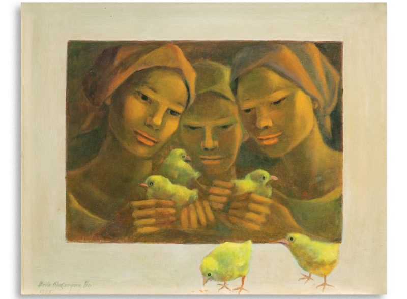 Lot 115, Anita Magsaysay-Ho (1914 – 2012), ‘Women with Chicks’, signed (lower left), dated 1985, oil on canvas, 16″ x 20″ (41 cm x 51 cm), sold for PhP 16,352,000