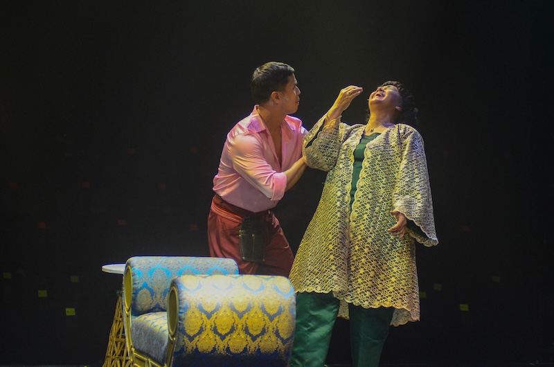 After watching both plays, I was struck most of all by how Quintos managed to anthropomorphize so eloquently the folly of vanity: This, I believe, is the unique thread tying the two, as staged and embodied by the people behind this presentation. In Evening at the Opera, we bear witness to the narcissism of Miranda (Abad Santos), the unhappy wife of a corrupt provincial politician; how she has used public funds, partly to spite her boorish husband, to bring a high-brow Italian opera with a price tag of P20 million to her rural town. In Kalungkutan, we must contend with the delusions of a president (Centenera-Buencamino) who has declared martial law and installed herself as monarch, her first move a literal, farcical makeover that reviewer Rikki Lopez has accurately described as a lost episode of Queer Eye for the Straight Dictator.