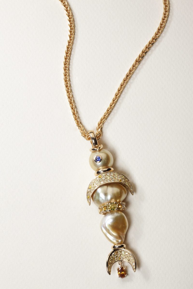 2019, A Touch of Whimsy Collection — jellyfish pendant with baroque pearls, blue sapphires, moonstones, seed pearls (From book ‘HANS BRUMANN’)