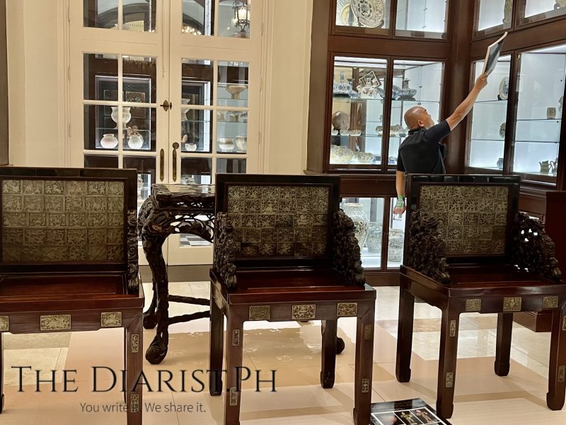 Intricate woodwork a vestige of the past at Goldenberg Mansion, photographed before the show, with stage curtain hiding the staircase (Photo by TheDiarist.ph)