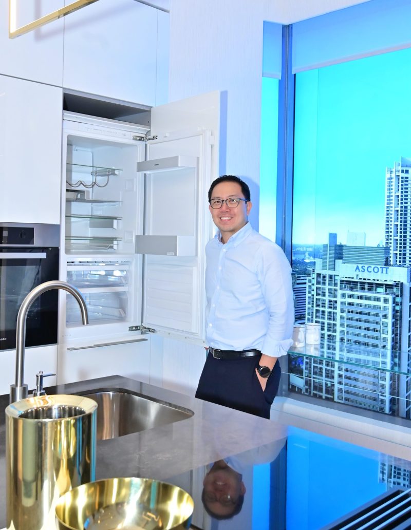 Ferdie Ong, general manager of Living Innovations and distributor of Gaggenau, shows off the built-in refrigerator, the standard feature in the show kitchen.