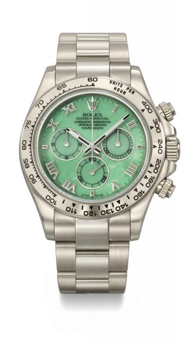 - CHF 201,600 for a Rolex Daytona with green chrysoprase dial (Est. CHF 50,000 )