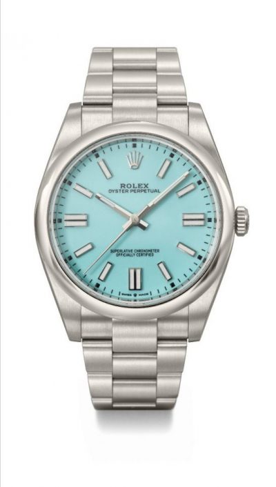 - CHF 69,300 for a Rolex Oyster perpetual ‘turquoise blue’ dial 41mm (Est. CHF 6,000)