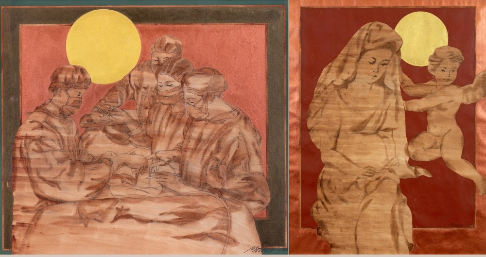 Though both were created by Edsel Moscoso, two paintings convey contrasting concepts. The artist’s Delivery Room Scene is devoid of sentimental motifs to depict the objective reality of a team of doctors seriously performing a procedure. In contrast, his Madonna with Cherub is evocative, showing a winged child hovering around a seemingly pregnant woman.