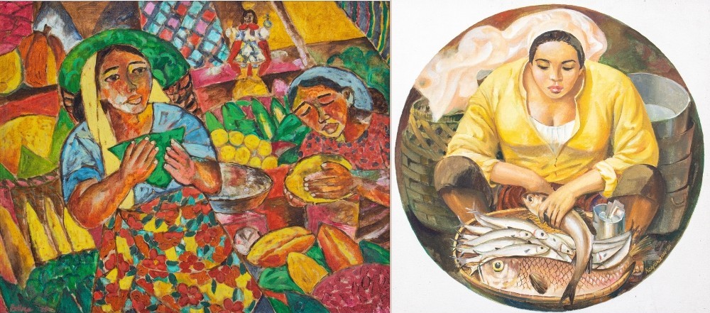 (Left) ‘Tag-araw,’ Norma Belleza, 1985, oil on canvas, estimated at P180,000–P240,000; ‘Si Sisa, Ang Tindera,’ Hugo Yonzon, 1991, oil on canvas, estimated at P55,000–P65,000