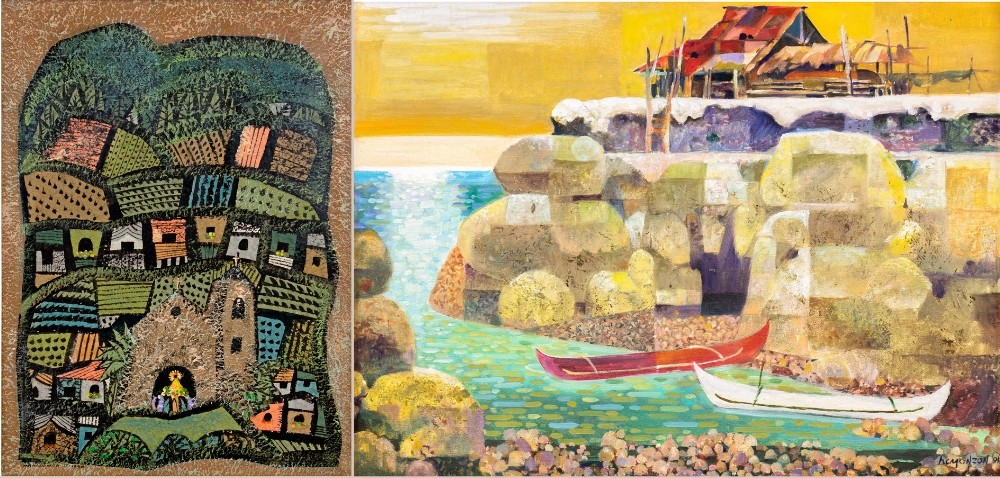 (Left) ‘Thanksgiving Ritual,’ Manuel Baldemor, 1990, acrylic on handmade paper, estimated at P48,000–P55,000; ‘Daungan,’ Hugo Yonzon, 1991, oil on canvas, estimated at P38,000–45,000
