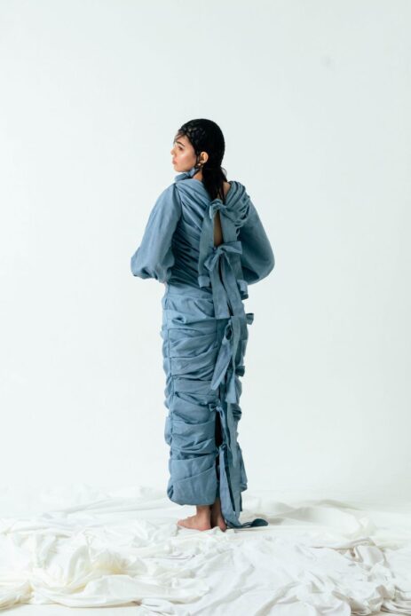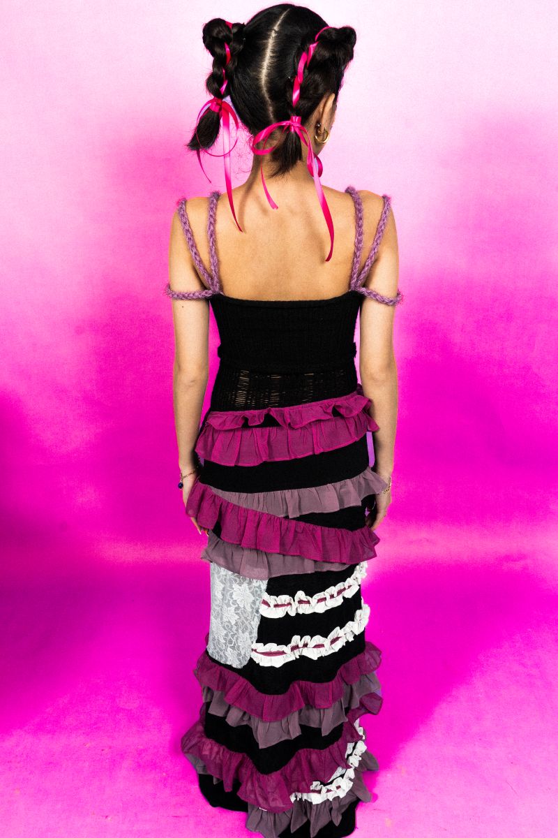 Alexandra Zarate, whose beribboned dress was a crowd favorite, said she “has a fear of missing out,” which inspired her collection. “It talks about my personal struggles as someone who’s in her teenage years and sometimes feels isolated in her own fears. I took inspiration from my own abstract feelings and tried to translate that into textures and colors.”