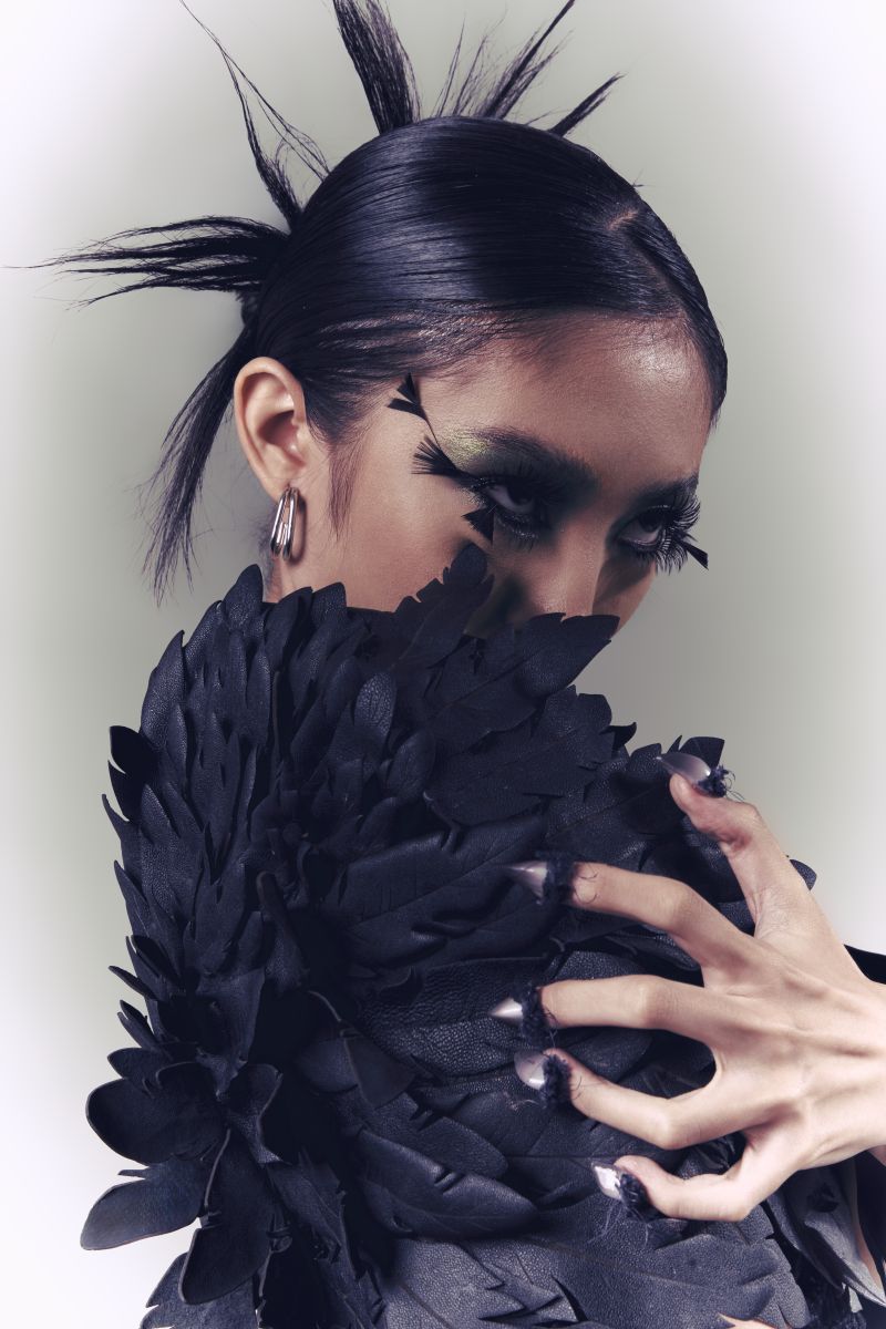 Graduate Paulette Navera showed her “Dharma” collection, which concluded with a snake eating a crow. “My upbringing inspired me. I’m a scholar of the school and I experienced the differences between myself and the other students who are more privileged than I am. I related my collection to Aesop’s Fables. Aesop was a slave who told stories. There’s a struggle with desire and the survival of the crow.”