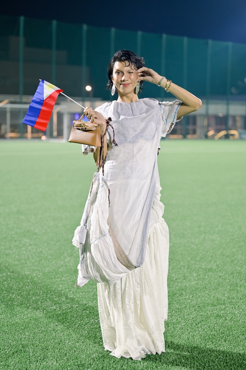 The FIFA-certified MOA Sky Football Pitch is actually up in the sky overlooking the panoramic vista of the Metro Manila skyline. It’s a football field on the rooftop of the destination mall SM MOA, enormously vast—a daunting challenge for any fashion creative director. How do you give the clothes the starring role when the novelty venue is clearly the starring role?