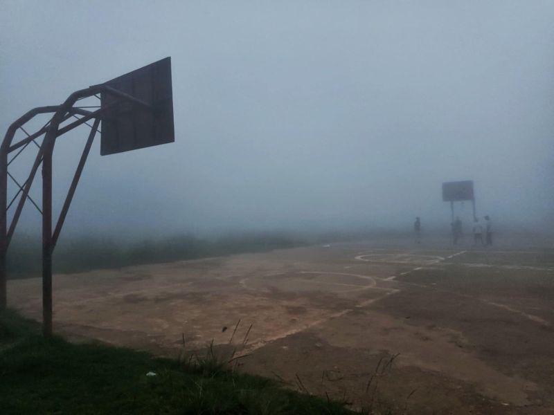 Kids, hardly visible, playing basketball in the fog